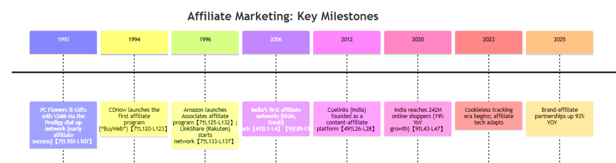 Tables 1-2 below compare India vs global figures, and Figure 1 (ahead in the article) shows major industry milestones. Overall, most brands (~81%) now run affiliate programs, and affiliates view it as a top channel: 79% of affiliates use SEO and 42% of influencers monetize with affiliate links.