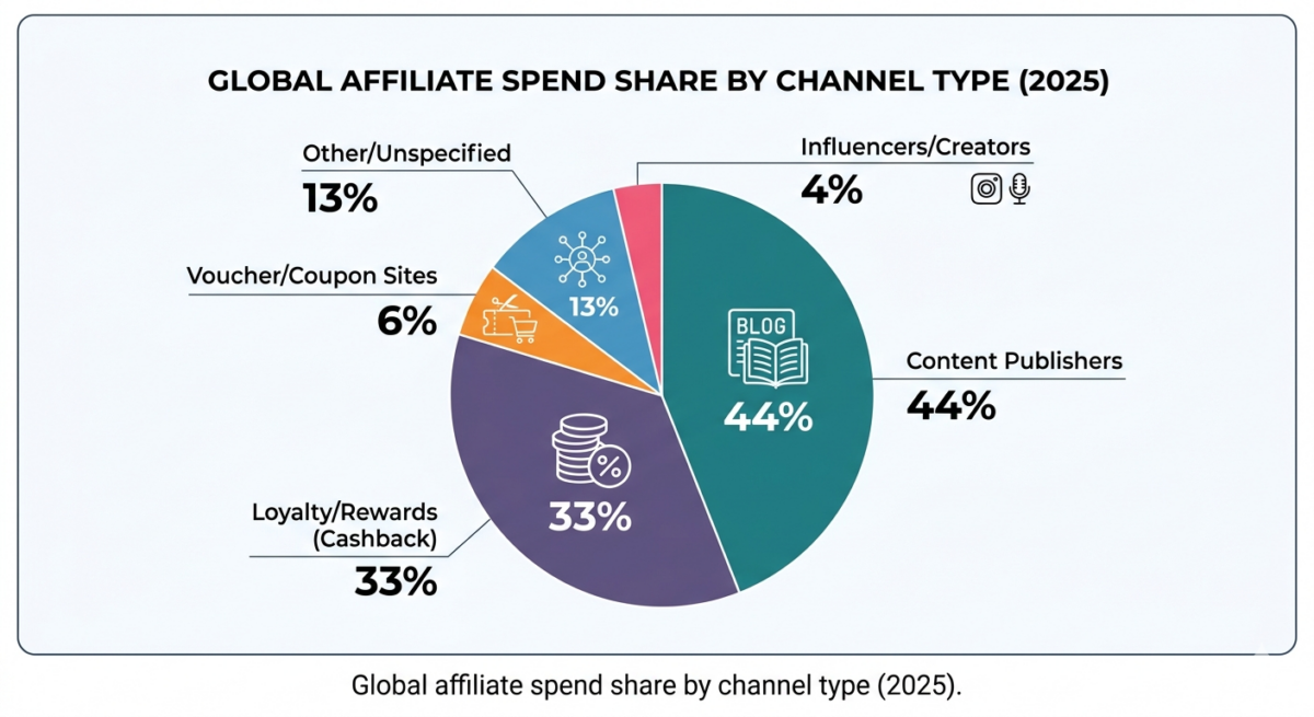 | Content Affiliates (%) | Many blogs/content creators | 44% of affiliate spend; 27% of sales | 2025 |