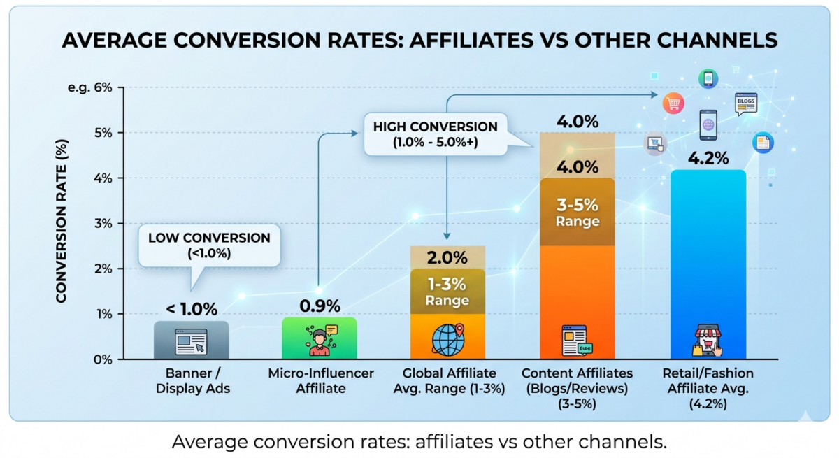 Affiliate-driven content (blogs, video) tends to outperform generic ads. For example, content affiliates (e.g. product review bloggers) often convert 3-5%, compared to <1% for banner ads. These dynamics make affiliate marketing an increasingly central revenue stream for both publishers and brands.