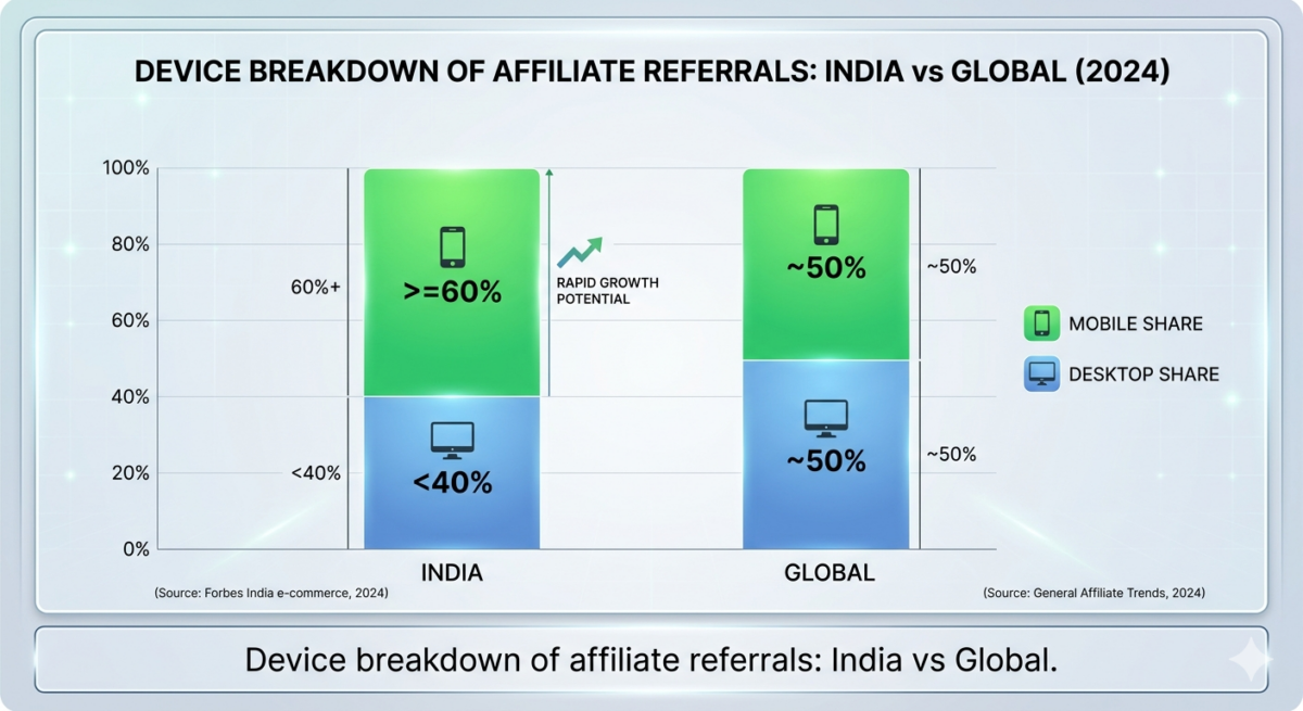 India’s affiliates are mobile-first. Over 880M Indians had the internet by 2023, mostly via smartphones. Forbes reports 60% of India’s e-comm transactions are on mobile.