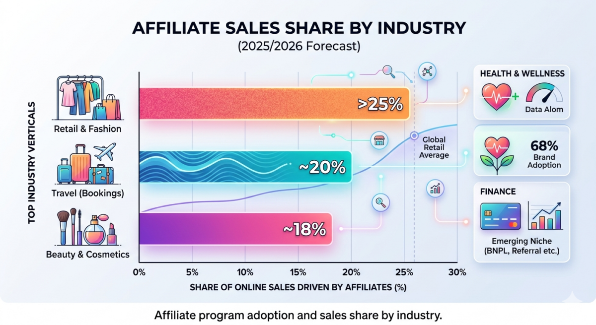 Other notable niches: health/wellness (68% of brands use affiliates) and beauty/cosmetics (affiliates now drive ~18% of sales).