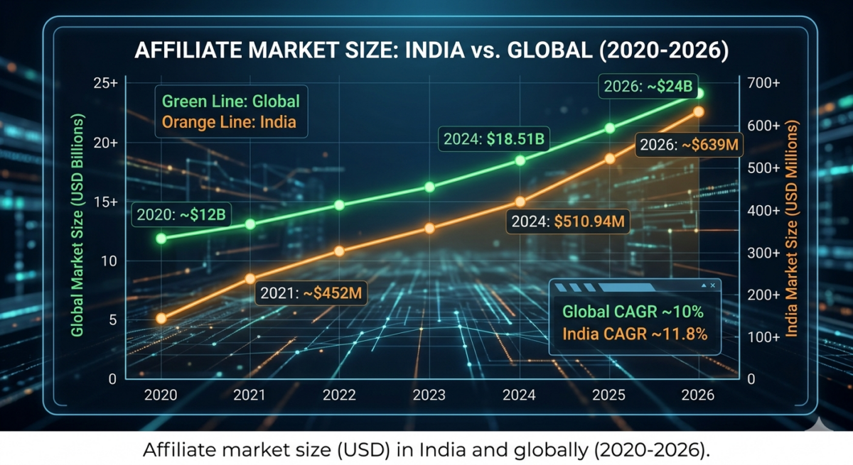 Affiliate marketing is a rapidly expanding channel both worldwide and in India. Globally, the affiliate market is billions of dollars in size, roughly $18.5 billion in 2024 (source: Cognitive Market Research), and projected to grow to $19-24 billion by 2025-2026.