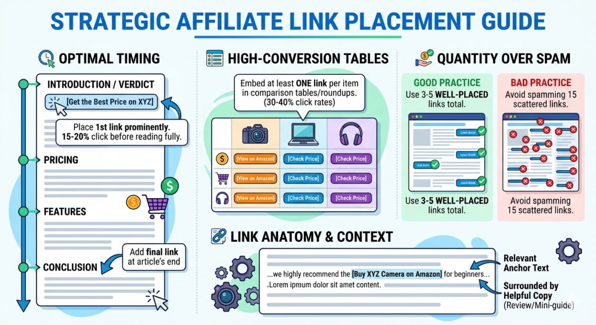 Place the first affiliate link prominently (e.g. in the intro or opening “verdict” of a review) because 15-20% of readers click before reading fully. Add additional links after pricing info and at the article’s end.