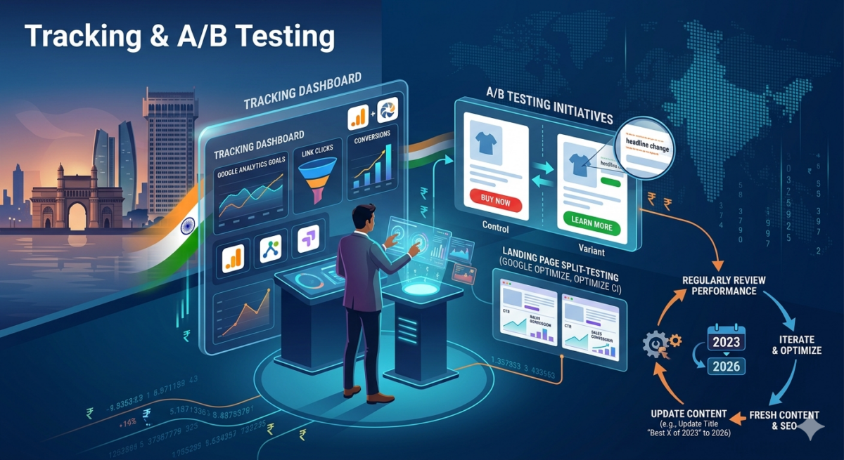 Use landing page split-testing (VWO, Optimizely, or Convert) and analyze metrics like CTR and sales conversion. Regularly review top-performing posts and iterate: update outdated stats or CTAs to keep content fresh (update titles like “Best X of 2023” to 2026 to maintain SEO).