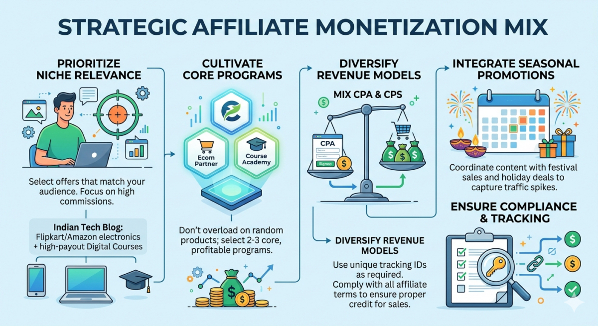 Prioritize offers that match your niche and have attractive commissions. For example, an Indian tech blog might focus on Flipkart/Amazon electronics, plus digital courses with higher payout. Don’t overload on random products; instead, cultivate 2-3 core affiliate programs that pay well and resonate with your audience.