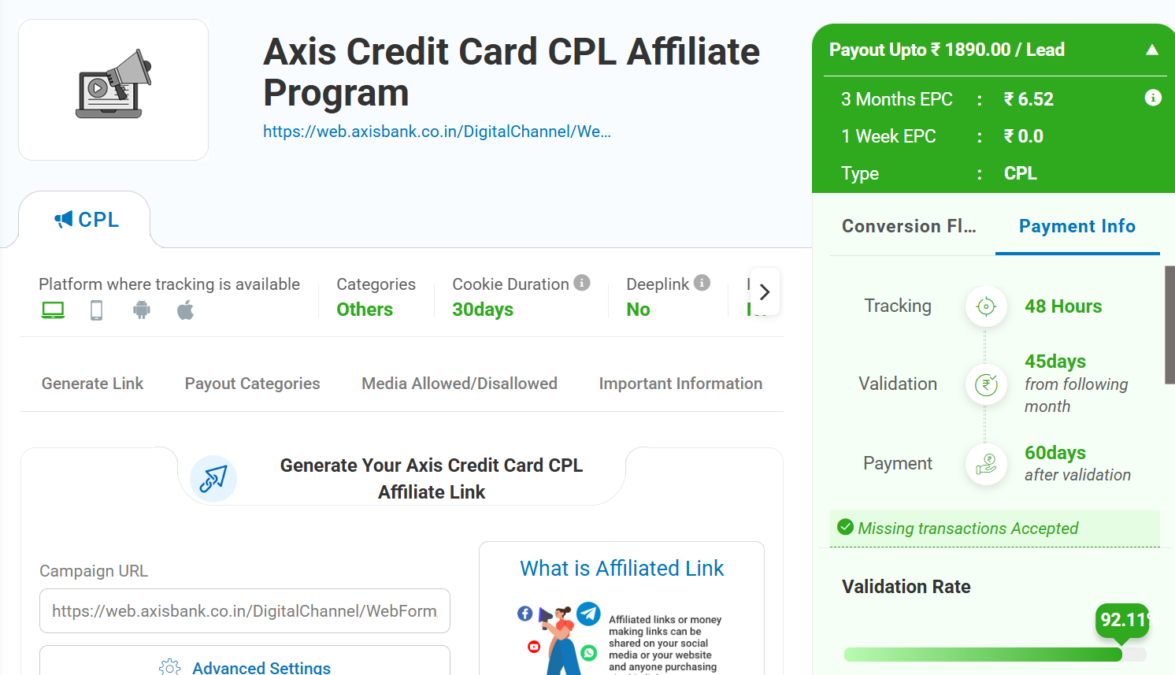 As told that credit cards are in demand, so the Axis Credit Card Affiliate Program has a high commission rate. It ranges from ₹540-₹2268 per Lead, depending on the card. Here lead is counted when the card gets activated by the user. High-end cards like magnus, atlas, infinite, etc. will generate higher commission earnings compared to other eligible ones!