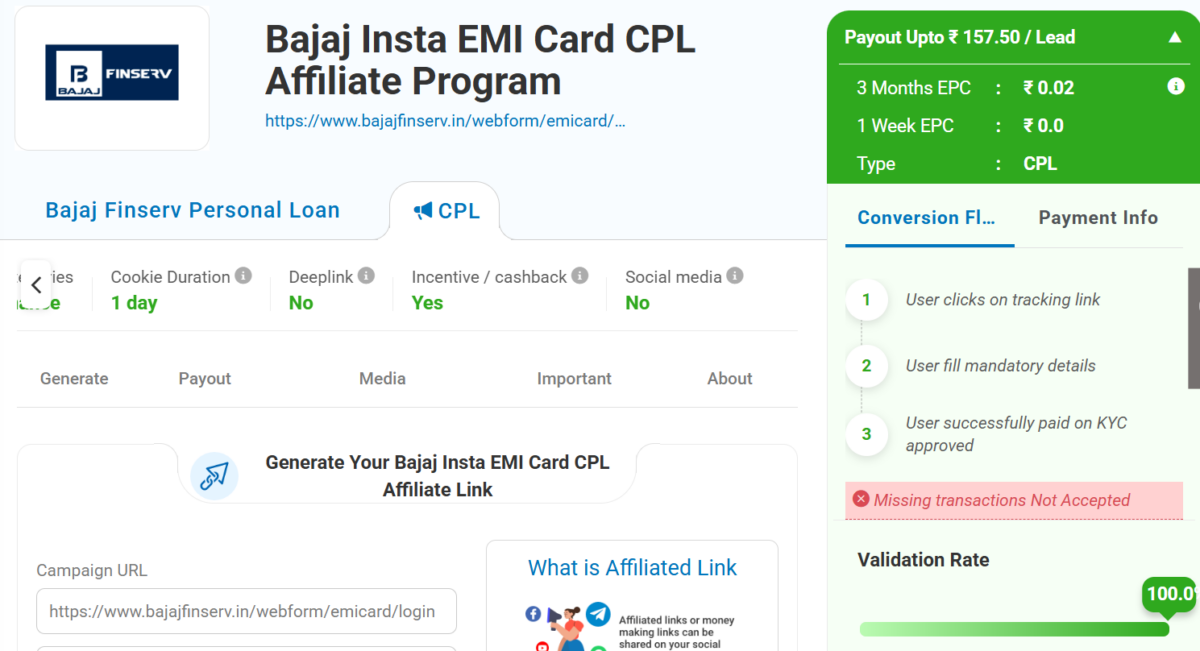 The Bajaj Electricals Insta EMI Affiliate Marketing Program is from Bajaj Finserv. It is a well-known company. Thus, its name should be enough to attract your target audience. This EMI card will help your users get easy EMIs on all online & offline shopping and transactions. Moreover, it is one of the Best BFSI Affiliate Marketing Campaigns in India.