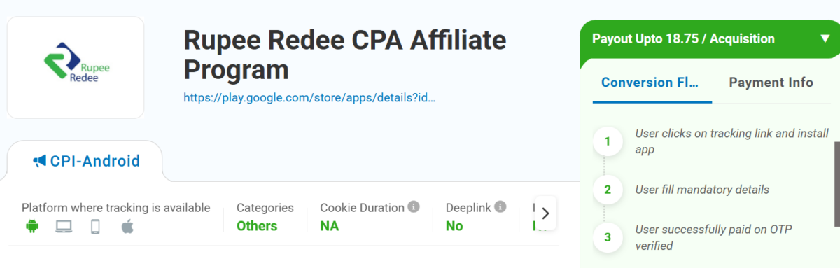 This affiliate program will earn you ₹18.75 to ₹22.50 per user. To successfully complete the process, users need to verify their mobile and email via OTP after downloading the app. The Rupee Redee mobile app has got millions in installs, and has a good star rating from thousands of users, so has a good user base.