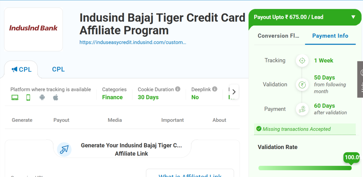 IndusInd Bank holds around 2.5 crore Indian customers. Moreover, it has presence in government entities, PSUs, and multinational corporates. As banks are the 1st priority of many middle class public, this campaign makes it to the useful & popular BFSI Affiliate Marketing Campaigns. Besides, the IndusInd Bajaj Tiger Credit Card Affiliate Program has higher commission and allows all bank user types except NTC!