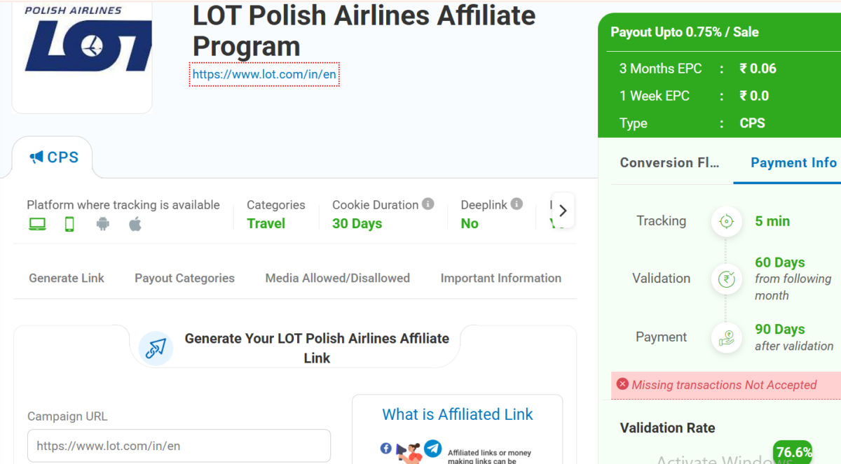 The commission rate is typically around 0.75-1.5% per sale. The cookie duration can be up to 30 days depending on the network, which is fairly generous for an airline program.
