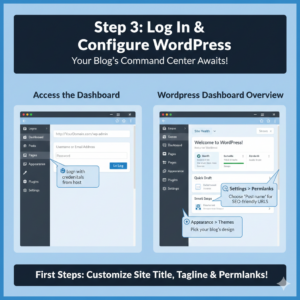 Before moving on, adjust a few settings under Settings → General: make sure your Site Title and Tagline are correct. In Settings → Permalinks, choose “Post name” format so your blog URLs are SEO-friendly.