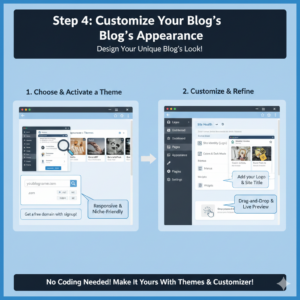 - Appearance → Themes: Pick or upload a theme for your blog’s look.
