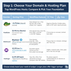 - Pick a domain and hosting plan (we used HostGator; alternatives: Bluehost, SiteGround, Hostinger).