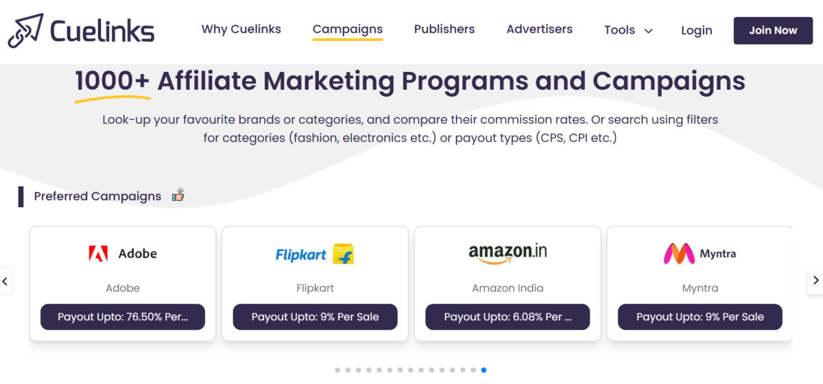 - Affiliate networks: These are platforms that list hundreds of affiliate programs across different companies. Examples include Cuelinks, ShareASale, CJ, Awin, and others. Joining a network means you can apply to many programs through one account. Networks provide dashboards where you search for products and get links. They simplify management, especially for multiple programs. Their key aspect is that they allow you to join affiliate programs which are inaccessible directly due to stricter rules (subscriber/follower count, traffic, active users, content type, etc.). Also, many brands depend on affiliate networks entirely so don’t have a direct program.