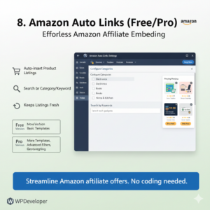 Ideal for Amazon affiliates on a budget. This plugin automatically inserts Amazon product listings into your posts or sidebars via shortcodes or widgets. You simply configure categories or keywords, and it pulls the latest products (with images, prices, and your Amazon Affiliate ID) directly from Amazon’s product feeds.